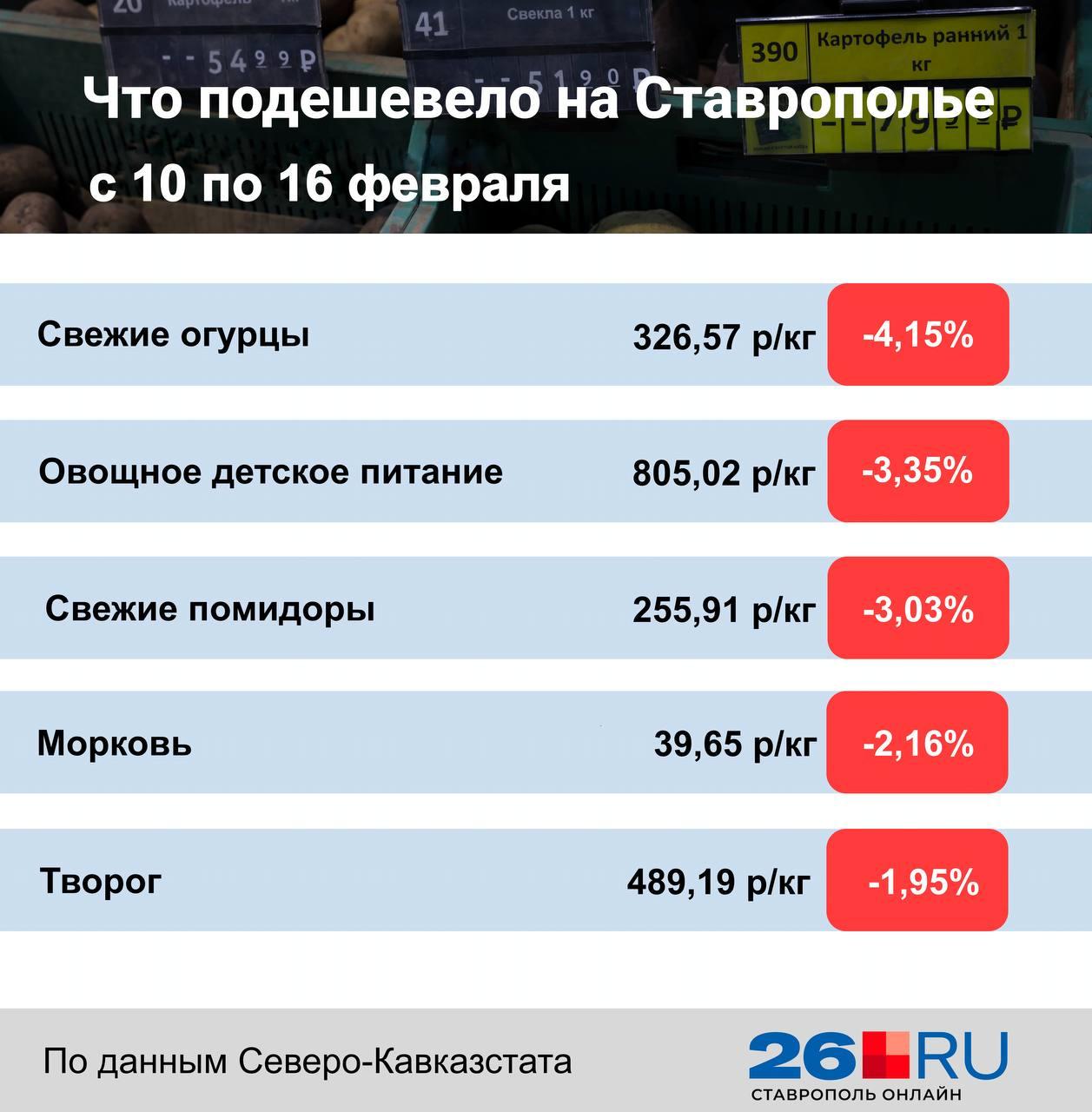 Среди товаров, которые подешевели, лидерами стали свежие огурцы. Их цена упала на 4,15% до 326,57 рубля за килограмм. Овощное детское питание подешевело на 3,35%, стоимость составила 805,02 рубля. Отметим, что в предыдущий период эти товары, наоборот, дорожали.
