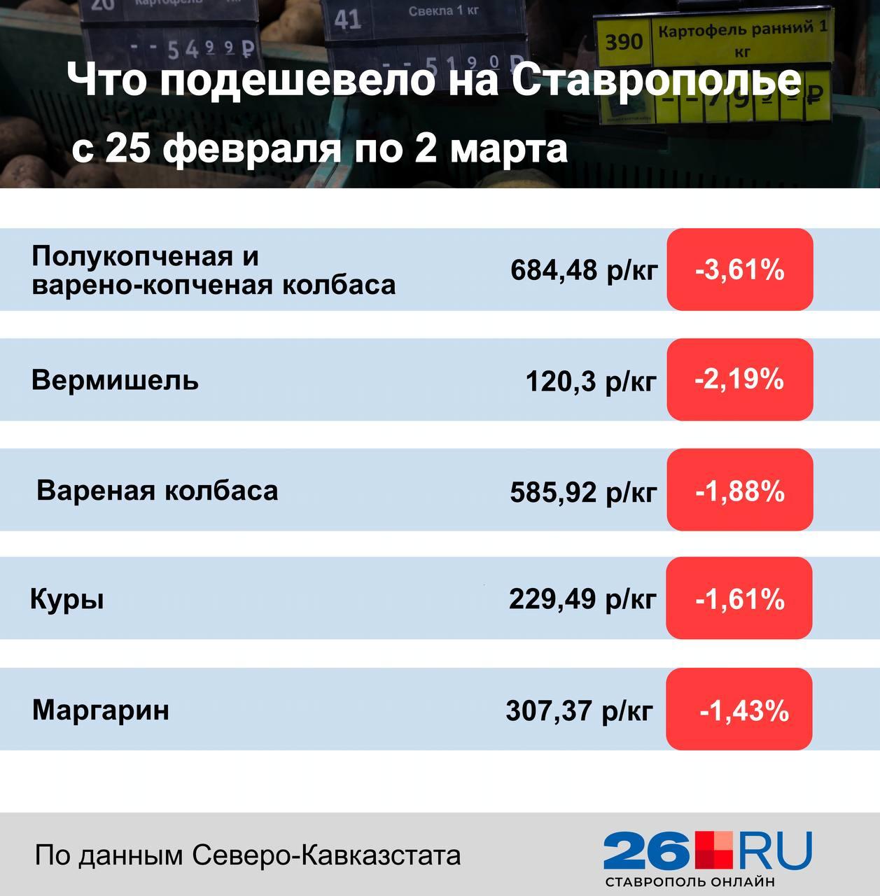 В то же время некоторые товары подешевели. Лидером снижения стала полукопченая и варено-копченая колбаса, цена на которую упала на 3,61% до 684,48 рубля за килограмм. Вермишель подешевела на 2,19%, её средняя стоимость составила 120,3 рубля.