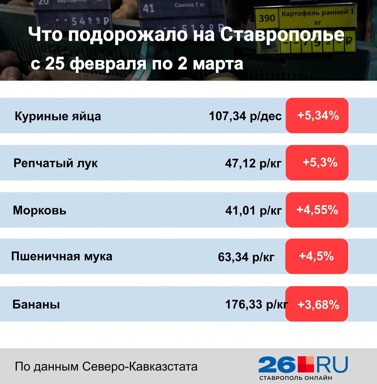 Согласно мониторингу Северо-Кавказстата, в течение одной из недель 2026 года на Ставрополье продолжился рост цен на многие продовольственные товары.