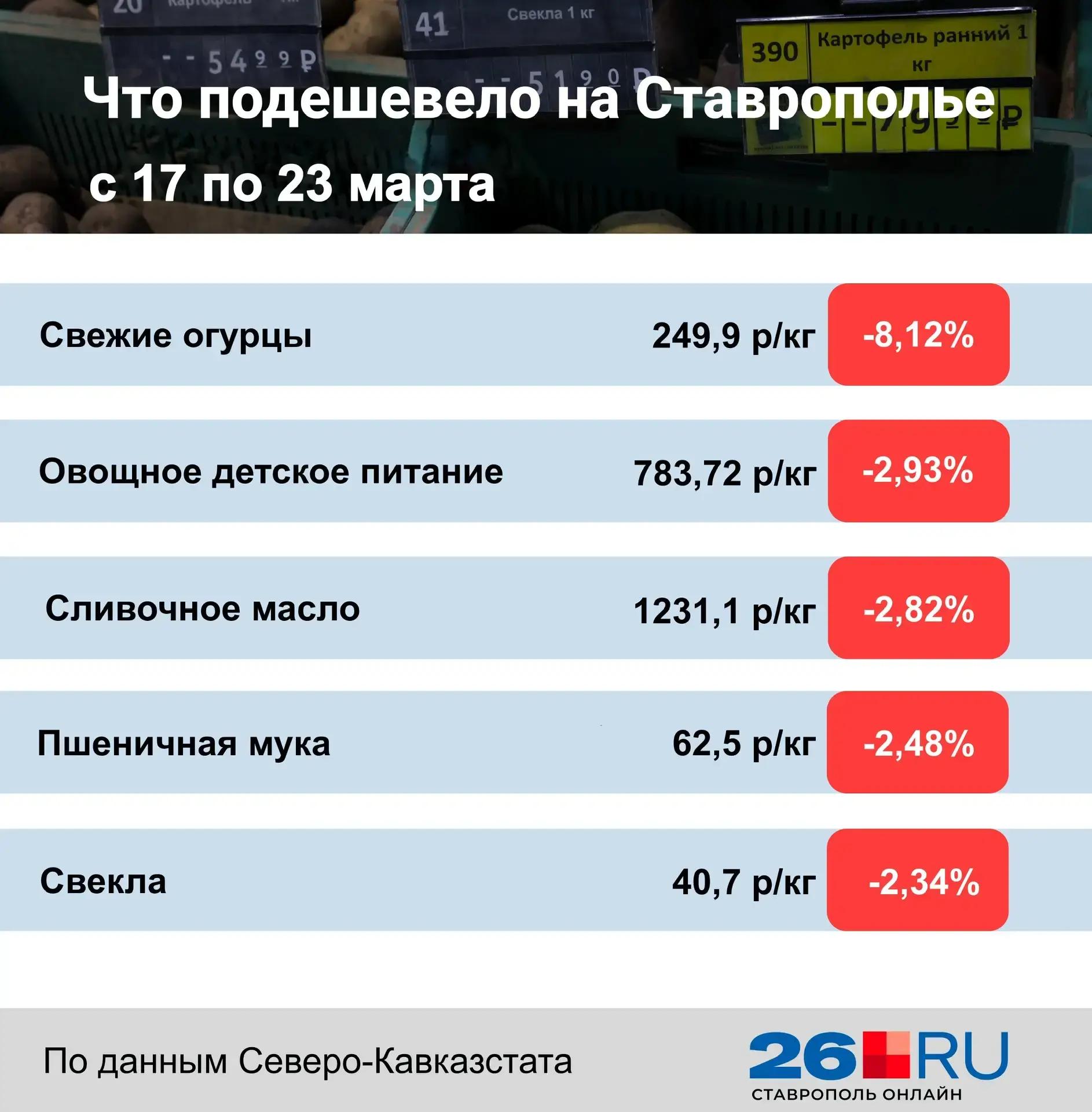 При этом ряд продуктов подешевел. Лидером снижения стали свежие огурцы, цена на которые упала на 8,12%, до 249,9 рубля за килограмм. На втором месте овощное детское питание, подешевевшее на 2,93%, до 783,72 рубля.