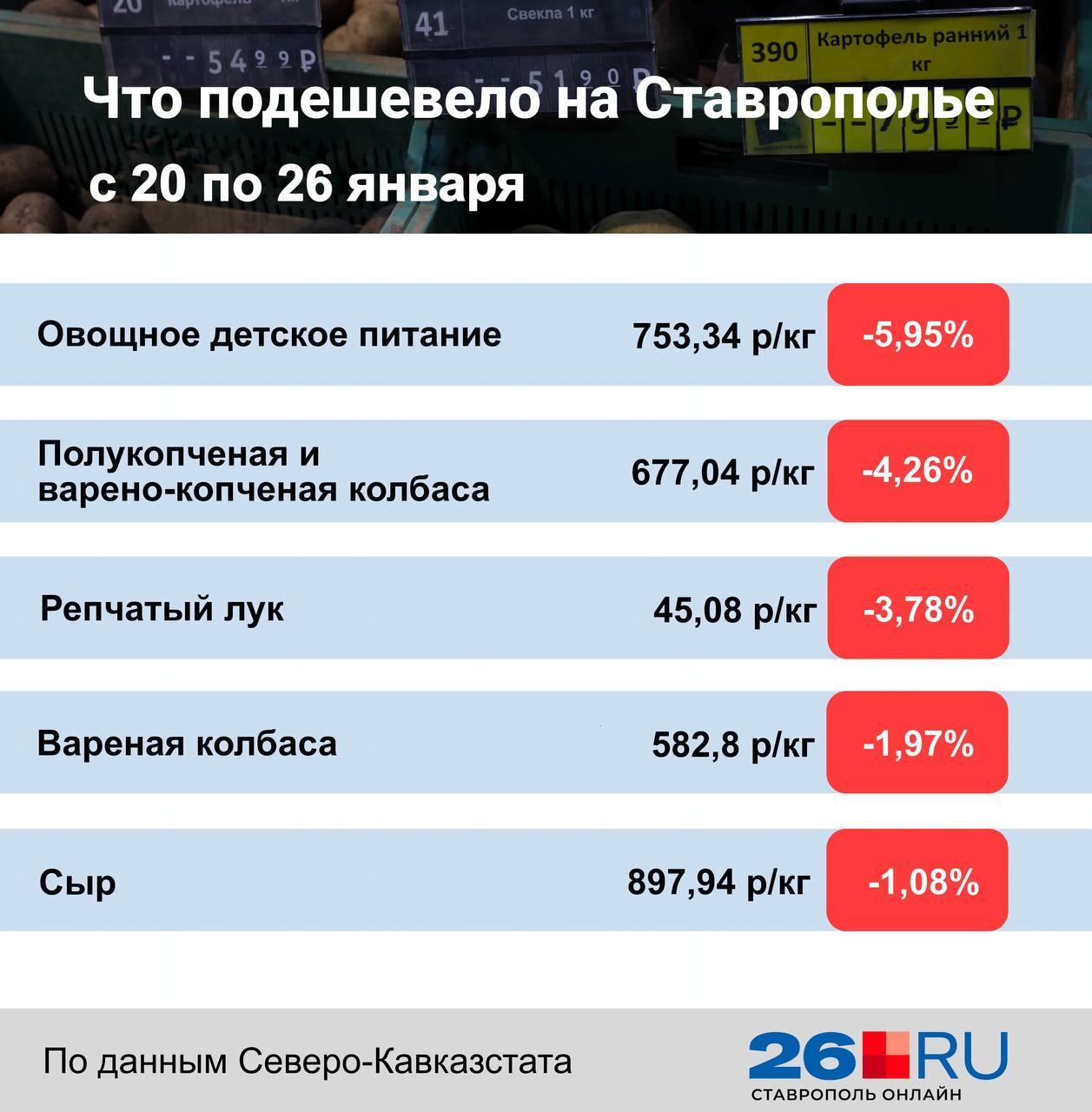 Среди продуктов, которые подешевели, лидирует овощное детское питание. Его стоимость снизилась на 5,95% до 753,34 рубля за килограмм. На втором месте полукопченая и варено-копченая колбаса, подешевевшая на 4,26% до 677,04 рубля.
