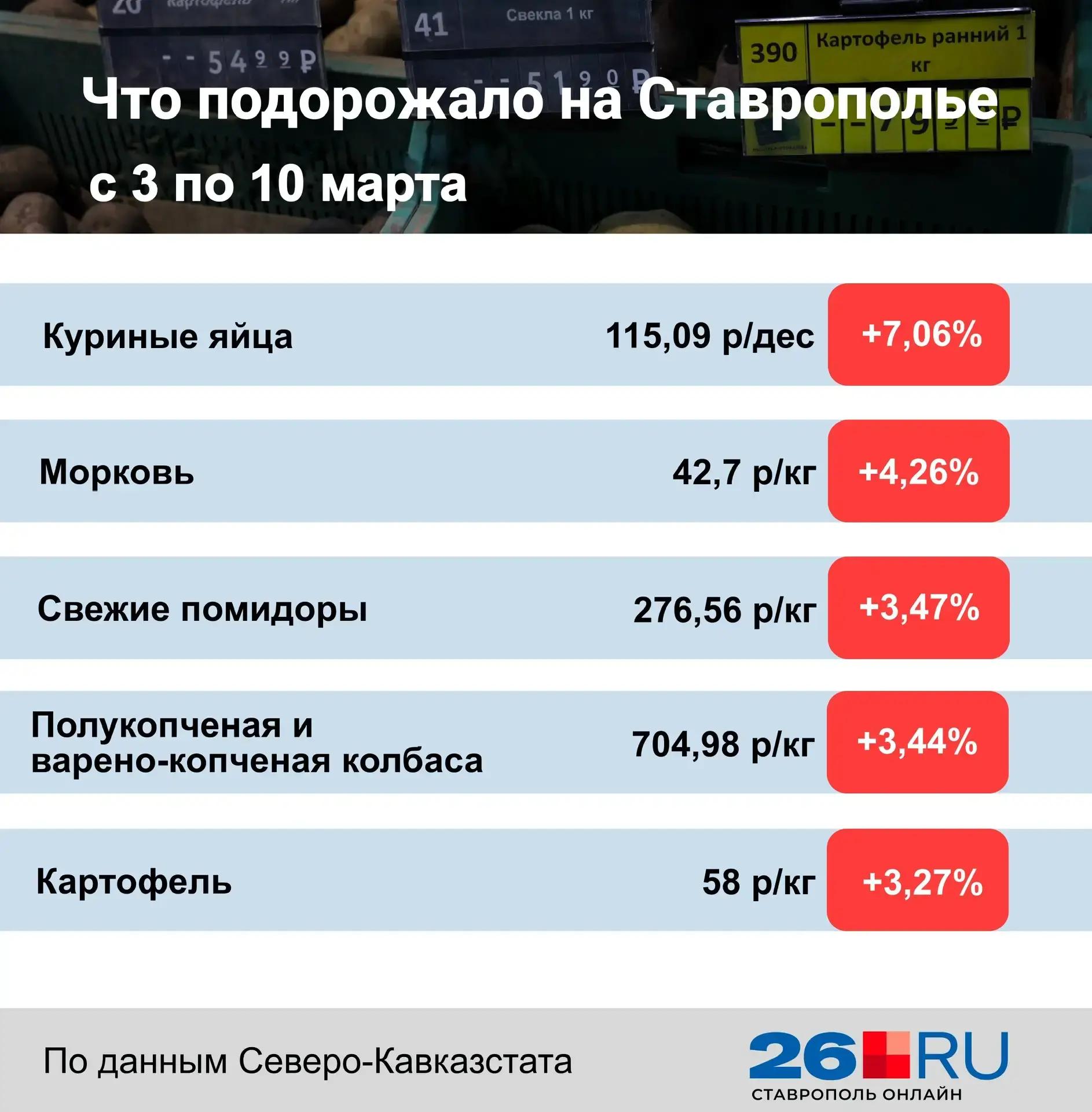 Согласно данным Северо-Кавказстата, в период с 3 по 10 марта в магазинах Ставропольского края продолжился рост цен на продовольственные товары.