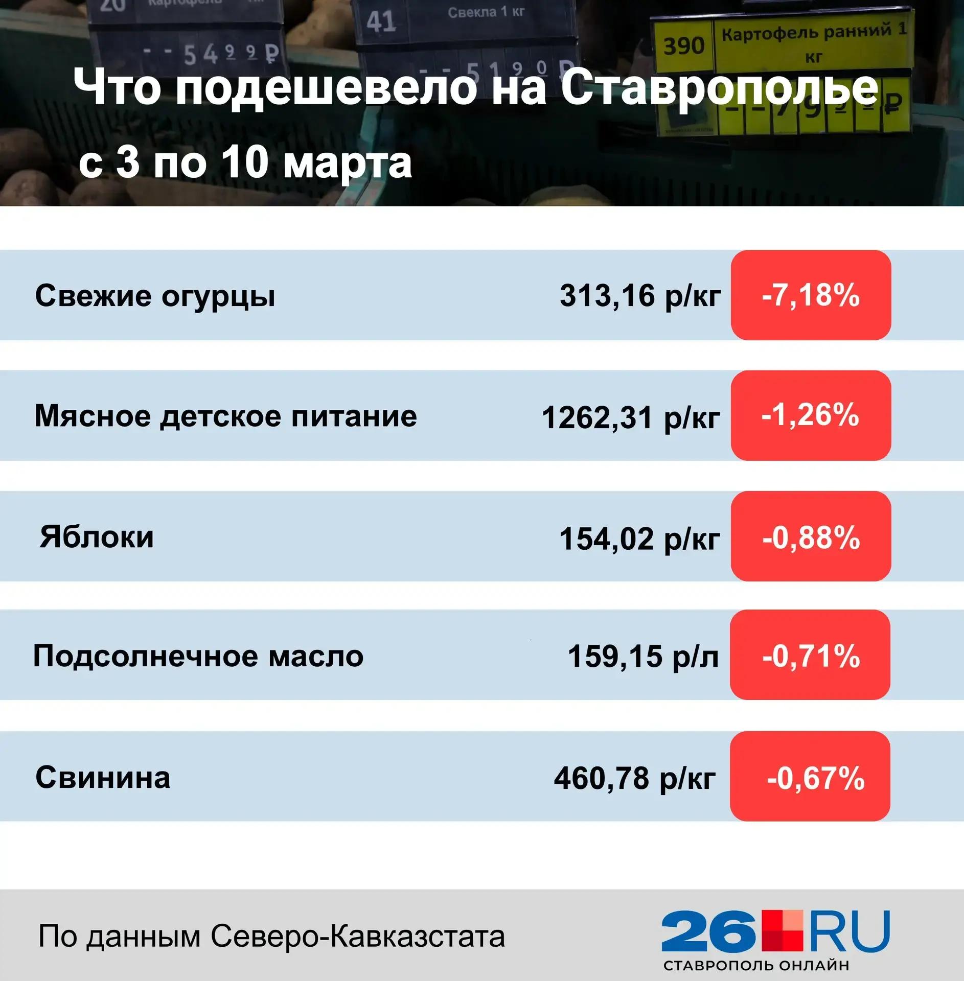 В то же время снизилась стоимость некоторых товаров. Сильнее всего подешевели свежие огурцы, упав в цене на 7,18% до 313,16 рубля за килограмм. Дешевле стало и мясное детское питание (-1,26%), которое теперь стоит 1262,31 рубля.