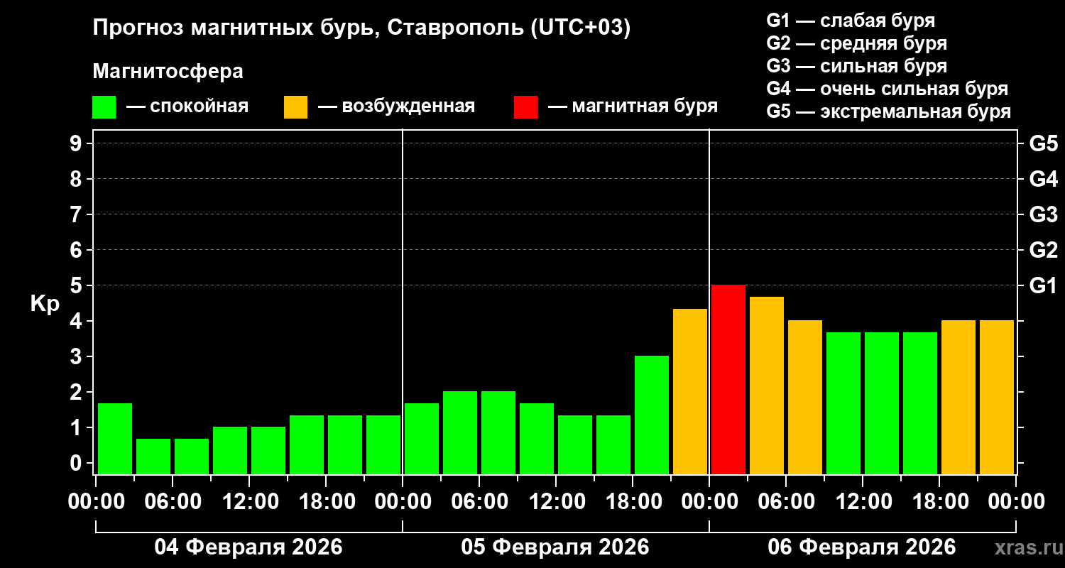 Пик магнитной бури ожидается в полночь, когда она достигнет уровня G1. Хотя этот уровень считается слабым, метеочувствительные люди могут ощутить его влияние. Повышенная активность магнитосферы сохранится до 10 утра 6 февраля.