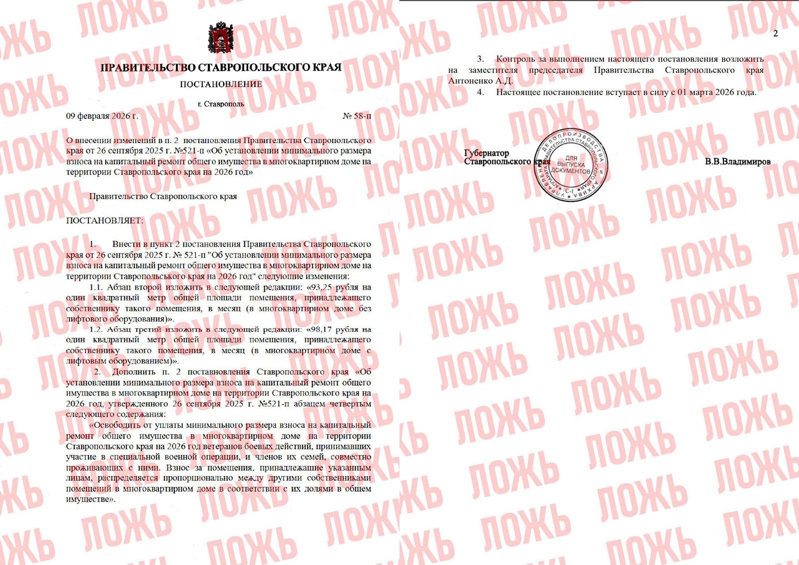 В Фонде заявили, что эти сведения абсолютно недостоверны. Взносы на капитальный ремонт в многоквартирных домах устанавливаются постановлением правительства Ставропольского края от 26 сентября 2026 года № 521-п и остаются неизменными.