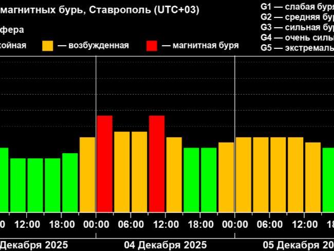 Жители Ставрополья могут ощутить воздействие уже завтра. Колебания начнутся с полуночи, причем сначала буря будет чуть слабее средней. Магнитосфера останется возбужденной несколько часов, а к 12:00 4 декабря регион накроет магнитная буря уровня G2.