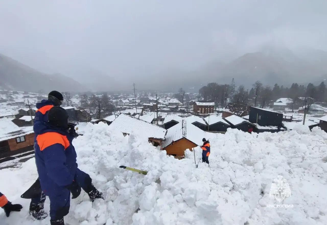 Работа спасателей и последствия лавины в посёлке Архыз