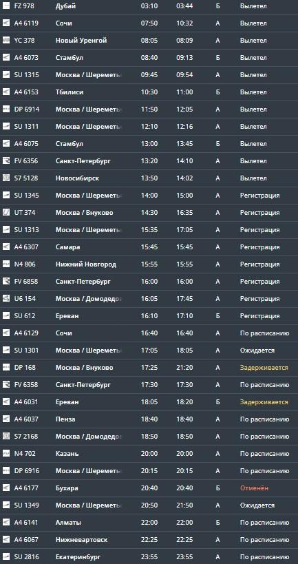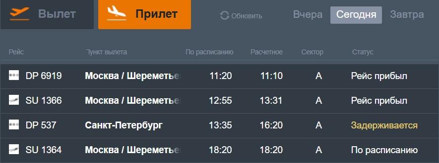 - Из Шереметьево: SU 1312, SU 1316 и SU 1300;