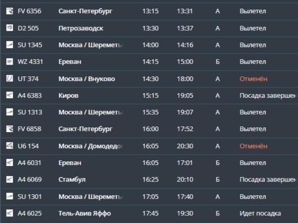 Согласно онлайн-табло, на данный момент отменены два рейса на вылет в Москву: UT 374 и U6 154.
