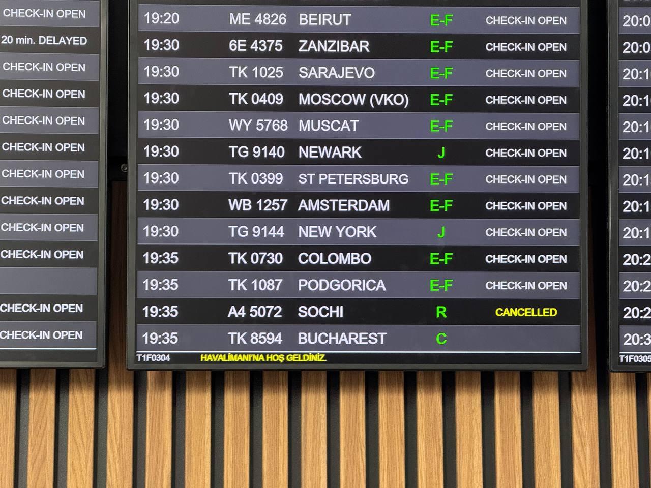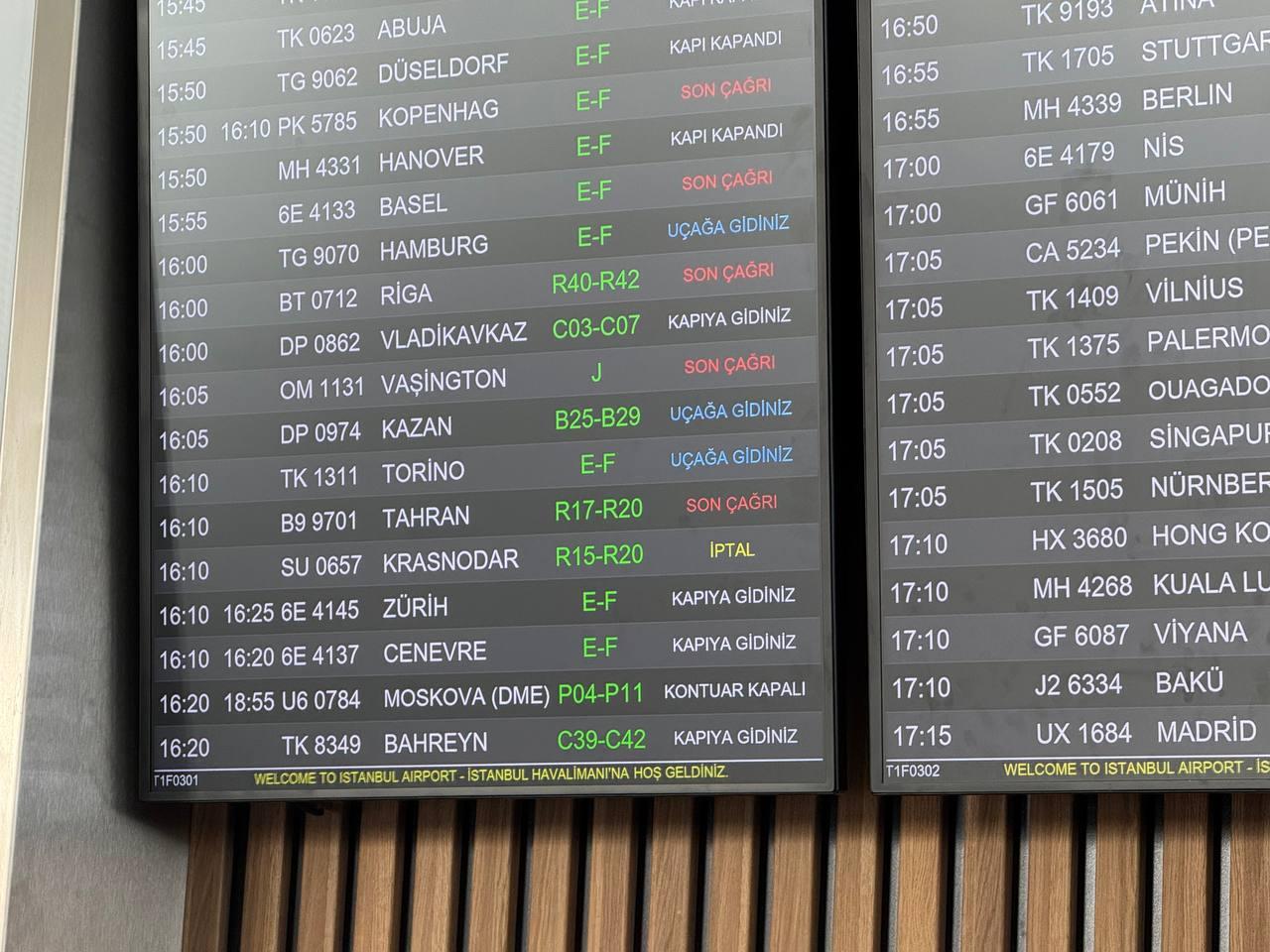 Отменены рейс SU0657 Стамбул–Краснодар, который должен был вылететь в 16:10, и рейс А45072 Стамбул–Сочи, запланированный на 19:35. Пассажиры этих рейсов остались в аэропорту без информации о том, когда смогут продолжить путешествие.